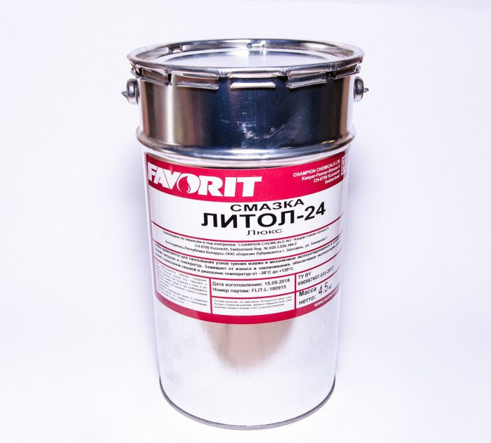 Смазка Литол-24 favorit 4.5кг Это многофункциональная смазка Литол-24 водостойкого типа антифрикционная. За основу изготовления берутся минеральные масла. Так же в ее состав входят, специальные присадки, что обеспечивают защиту от коррозии и окисления. Идеально подойдет для узлов трения, так как ее рабочий температурный диапазон очень большой, от -40°С до +120°С