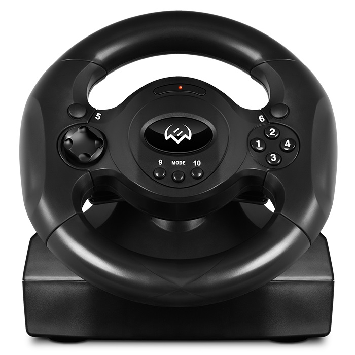 SVEN GC-W300 Racing Wheel, Rubber coating of the wheel for comfortable driving, Two axes, D-Pad, 10 additional buttons, Vibration feedback function, USB, Black Тип устройства игровой руль Поддержка Windows XP/Vista/7/8/10 Интерфейс подключения USB Технология связи проводная Режим работы цифровой и аналоговый Оси и джойстики 2 оси, 8-позиционный джойстик Количество кнопок, шт. 10 Функция виброотдачи есть Диаметр руля 9" (225 мм) Угол поворота, градусов 180