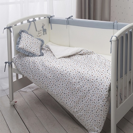 Комплект постельных принадлежностей для детей "Little Forest" т.м.Perina, арт. ЛФ7-01.4 (цвет Аквамарин) Комплект Perina Little Forest из нежного сатина в двух приятных оттенках. Приглушенные цвета успокоят малыша перед сном, стильный лесной узор на пододеяльнике и наволочке гармонично чередуется с однотонными деталями комплекта. В этой модели всего в меру, такой дизайн впишется практически в любой интерьер. Но и скучать не придется: аппликация-олененок на бортике уже ждет знакомства с новым другом. Дополнительной изюминкой набора стала декоративная подушка с рюшами. Бортик составной, изящные завязки и вышивка выглядят утонченно, при этом можете не сомневаться в их надежности. Проверенное качество пошива — гарантия того, что комплект прослужит долго. И останется как новый, благодаря 100% натуральному сатину и реактивному способу окрашивания. Дополнительно к комплекту можно приобрести балдахин. Цвет: молочный Простыня на резинке120х60 см Наволочка60х40 см Подушка60х40 см Пододеяльник на молнии143х102 см Одеяло140х100 см Бампер со съемным чехлом360х38 см Декоративная подушка26х26 см