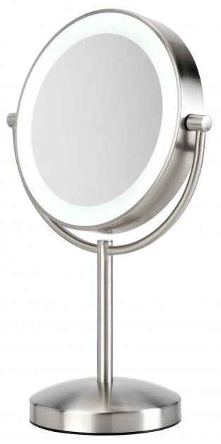 Mirror BaByliss 9437E, Table mirror, circular O 110mm, 8x LED, ring-shaped,classic and 5-way magnification,3x AA battery, mains operation Особенности Двойное, С подсветкой, С увеличением Вид Настольное Форма Круглое Размеры (Д х Ш), см 45 х 29 Увеличение х8 Вес 1 кг Подсветка Светодиодная Дополнительные характеристики Двустороннее: зеркало с 8-ми кратным увеличением, Вращающаяся рамка, Матовое металлическое покрытие, Светодиодная подсветка по окружности с мягким теплым светом (имитирующая нормальное комнатное освещение) Питание от сети Мощность: 20 Вт Управление механическое Цвет матовый металл Длина шнура: 2,7 м Диаметр: 21.6 см Страна регистрации бренда Франция