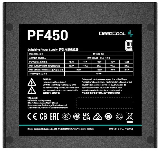 PSU DEEPCOOL PF450, 450W, ATX12V V2.4, 80 PLUS, Active PFC+Double tube forward, 120mm Hypro Bearing, >85% Under Typical Load(50% Loading), +12V (35A), 20+4 Pin, 1xEPS(4+4Pin), 6x SATA, 2xPCI-E(6+2pin), 2x Periph., OPP/OVP/SCP, ErP 2010, MTBF100000Hours,