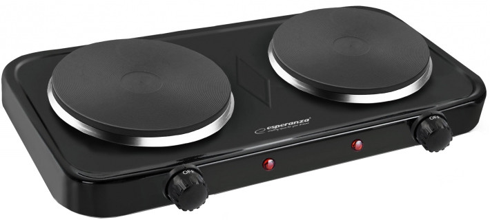 Electric Hot Plate Esperanza COTOPAXI EKH010K (EKH004K) Black, 2000W (1x1000W, 1x1000W), 5 temperature degrees thermostatic protection against overheating The indicator light (on / off) Heat-resistant surface materials 2 heating plates
