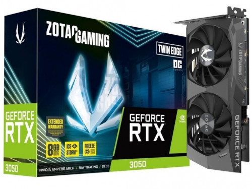 Видеокарта ZOTAC GeForce RTX 3050 Twin Edge 8GB GDDR6, 128bit, 1777/14000Mhz, Ampere, PCIeX16 4.0, Dual Fan / IceStorm 2.0, 1xHDMI, 3xDisplayPort, Active Fan Control/ FREEZE Fan Stop, Cooper Heat pipes, FireStorm, Metal Backplate, Medium Pack