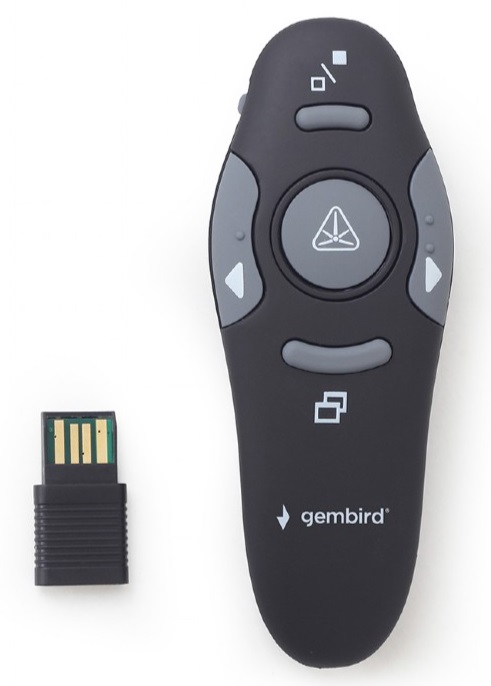 Gembird WP-L-01 Wireless presenter with laser pointer, Wireless 2.4 GHz, Power supply: 2 x AAA battery, up to 10 m, Net weight: 84 g Беспроводной пульт управления презентацией с лазерной указкой Беспроводной, т.е. вы свободны двигаться во время презентации. Кнопки управления позволяют легко управлять слайдами. Полезная лазерная указка поможет "подсветить" любую точку презентации, даже в полумраке Plug & Play: просто вставьте батарейку и подключите к USB порту. Беспроводной пульт управления презентацией для PowerPoint Лазерная указка красного цвета для концентрации внимания аудитории в нужной точке 4 кнопки для управления презентацией: следующий/предыдущий слайд, вкл/выкл экрана, стоп/запуск презентации, вкл/выкл лазерной указки Кнопка выключения полезна для экономии батареи Plug & Play, программного обеспечения не требуется