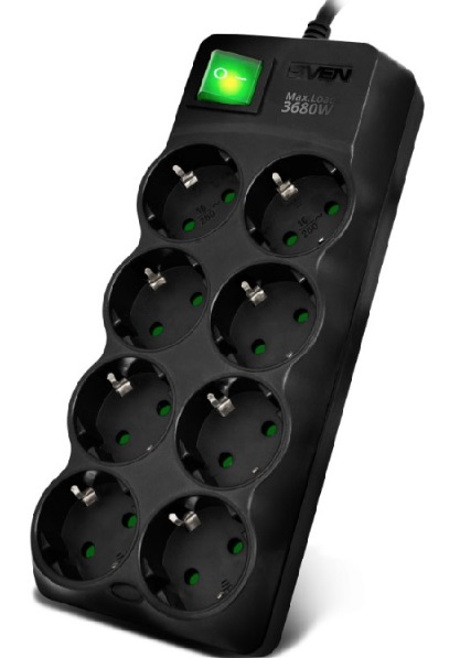 Surge Protector 8 Sockets, 1.8m, Sven SF-08E-16, Black, flame-retardant material