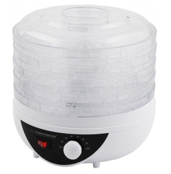 Ap. de deshidratare/fruct. Esperanza Chanterelles EKD002 Количество секций 5 Мощность 250 Вт Тип управления механическое Терморегулятор 35-70 °C Защита от перегрева да Материал корпуса пластик Цвет белый Размеры 220x282x280 мм Вес 2.1 кг Производитель Esperanza